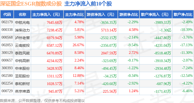资金流向方面,深证国企ESGR(470055)指数成份股当日主力资金净流出合计7.71亿元,游资资金净流入合计5986.96万元,散户资金净流入合计7.11亿元。成份股资金流向详情见下表: