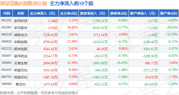 资金流向方面,深证回购R(470063)指数成份股当日主力资金净流出合计9.35亿元,游资资金净流入合计2.25亿元,散户资金净流入合计7.1亿元。成份股资金流向详情见下表: