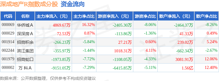 资金流向方面,深成地产R(471001)指数成份股当日主力资金净流出合计6804.91万元,游资资金净流出合计8997.54万元,散户资金净流入合计1.58亿元。成份股资金流向详情见下表: