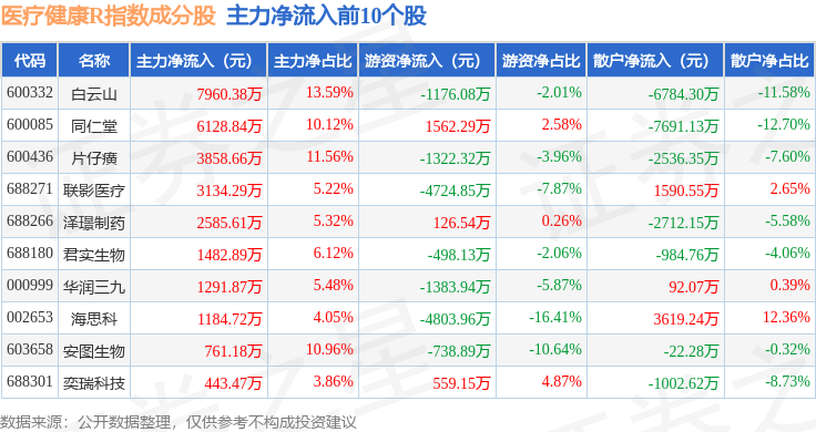 资金流向方面,医疗健康R(480016)指数成份股当日主力资金净流出合计9.17亿元,游资资金净流入合计2.4亿元,散户资金净流入合计6.76亿元。成份股资金流向详情见下表: