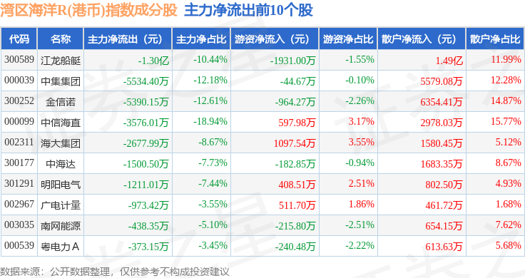 资金流向方面,湾区海洋R(港币)(480020)指数成份股当日主力资金净流出合计3.58亿元,游资资金净流入合计1693.94万元,散户资金净流入合计3.41亿元。成份股资金流向详情见下表: