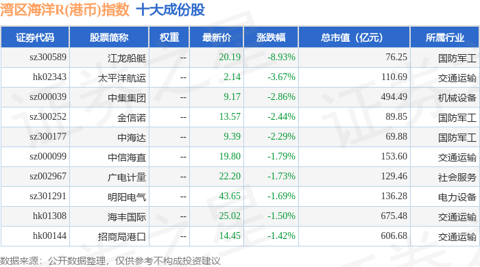 湾区海洋R(港币)(480020)指数十大成份股详情如下: