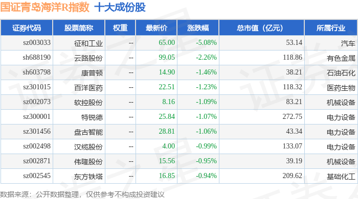 国证青岛海洋R(480532)指数十大成份股详情如下: