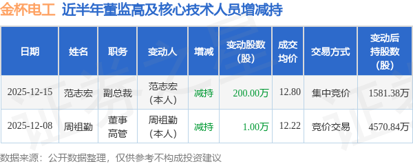 证券之星消息,根据12月15日市场公开信息、上市公司公告及交易所披露数据整理,金杯电工(002533)最新董监高及相关人员股份变动情况:2025年12月15日公司副总裁范志宏共减持公司股份200.0万股,占公司总股本为0.2725%。变动期间公司股价下跌1.18%,12月15日当日收盘报12.58元。