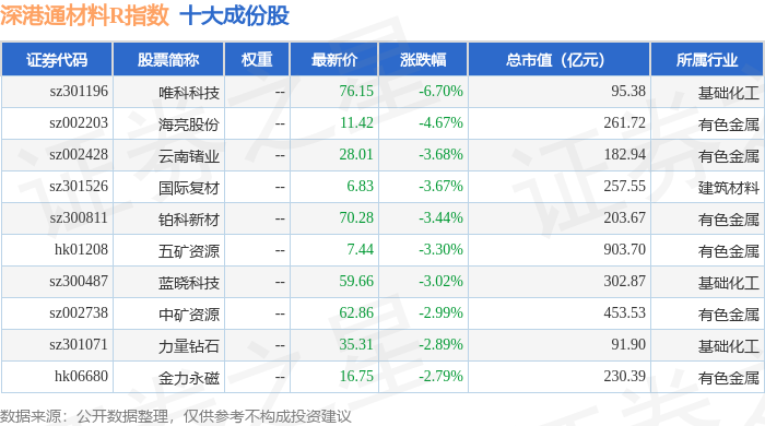 资金流向方面,深港通材料R(483015)指数成份股当日主力资金净流出合计38.86亿元,游资资金净流入合计3.5亿元,散户资金净流入合计35.36亿元。成份股资金流向详情见下表: