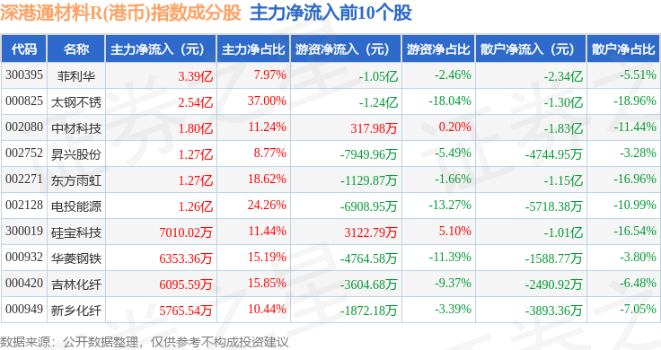 资金流向方面,深港通材料R(港币)(483016)指数成份股当日主力资金净流出合计38.86亿元,游资资金净流入合计3.5亿元,散户资金净流入合计35.36亿元。成份股资金流向详情见下表: