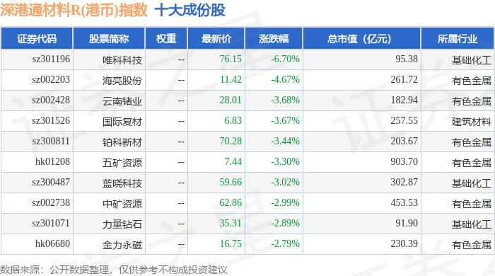 深港通材料R(港币)(483016)指数十大成份股详情如下:
