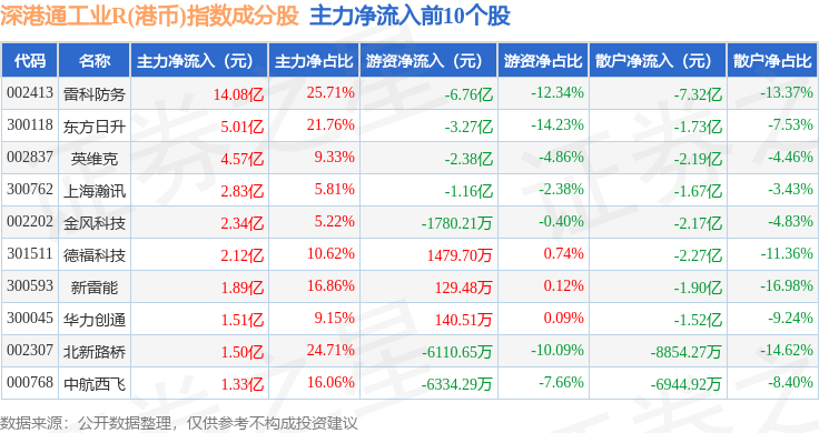 资金流向方面,深港通工业R(港币)(483018)指数成份股当日主力资金净流出合计28.6亿元,游资资金净流出合计5.56亿元,散户资金净流入合计34.16亿元。成份股资金流向详情见下表: