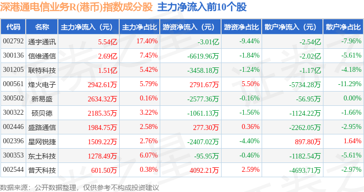 资金流向方面,深港通电信业务R(港币)(483030)指数成份股当日主力资金净流出合计32.15亿元,游资资金净流出合计9182.77万元,散户资金净流入合计33.07亿元。成份股资金流向详情见下表: