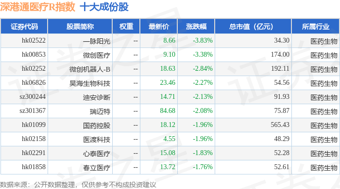 证券之星消息,12月15日,深港通医疗R(483035)指数报收于4846.36点,跌0.27%,成交63.51亿元,换手率0.72%。当日该指数成份股中,上涨的有18家,蓝帆医疗以10.0%的涨幅领涨,下跌的有36家,一脉阳光以3.83%的跌幅领跌。
