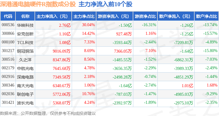 资金流向方面,深港通电脑硬件R(483043)指数成份股当日主力资金净流出合计90.76亿元,游资资金净流入合计16.74亿元,散户资金净流入合计74.02亿元。成份股资金流向详情见下表: