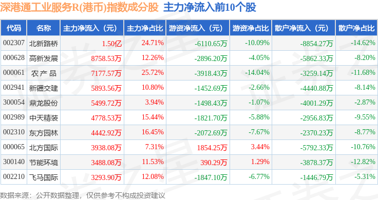 资金流向方面,深港通工业服务R(港币)(483056)指数成份股当日主力资金净流出合计2309.87万元,游资资金净流出合计2.2亿元,散户资金净流入合计2.43亿元。成份股资金流向详情见下表: