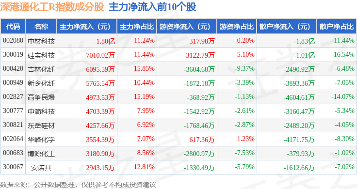 资金流向方面,深港通化工R(483063)指数成份股当日主力资金净流出合计9.13亿元,游资资金净流入合计1.32亿元,散户资金净流入合计7.81亿元。成份股资金流向详情见下表: