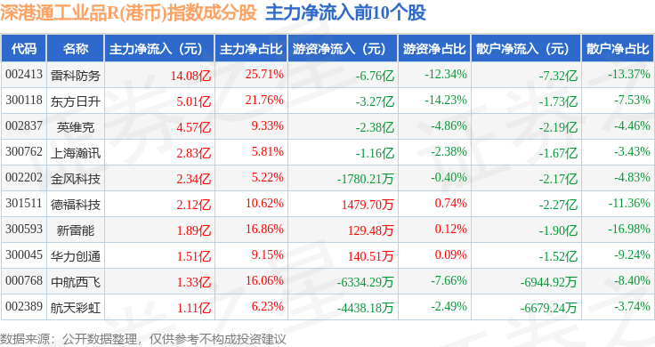 资金流向方面,深港通工业品R(港币)(483070)指数成份股当日主力资金净流出合计27.54亿元,游资资金净流出合计3.78亿元,散户资金净流入合计31.32亿元。成份股资金流向详情见下表: