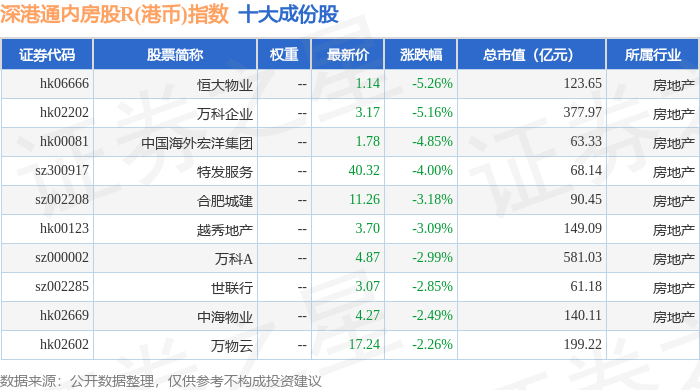 深港通内房股R(港币)(483084)指数十大成份股详情如下: