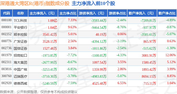 资金流向方面,深港通大湾区R(港币)(483090)指数成份股当日主力资金净流出合计37.32亿元,游资资金净流入合计8.74亿元,散户资金净流入合计28.58亿元。成份股资金流向详情见下表: