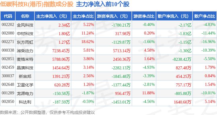 资金流向方面,低碳科技R(港币)(483161)指数成份股当日主力资金净流出合计40.27亿元,游资资金净流入合计9.95亿元,散户资金净流入合计30.32亿元。成份股资金流向详情见下表: