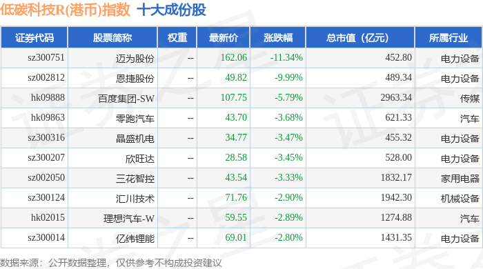 低碳科技R(港币)(483161)指数十大成份股详情如下: