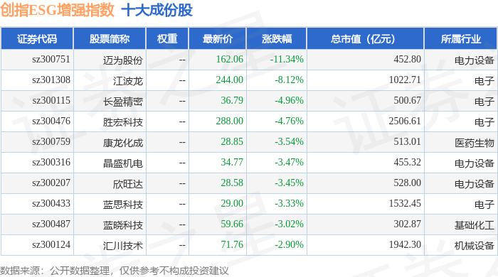 近10日内创指ESG增强(970034)指数成份股做了调整,新纳入了6只股票,剔除了6只股票。