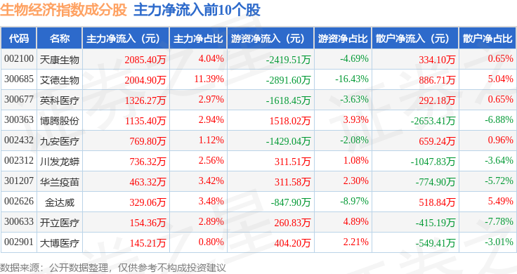 资金流向方面,生物经济(970038)指数成份股当日主力资金净流出合计5.01亿元,游资资金净流出合计7208.76万元,散户资金净流入合计5.73亿元。成份股资金流向详情见下表: