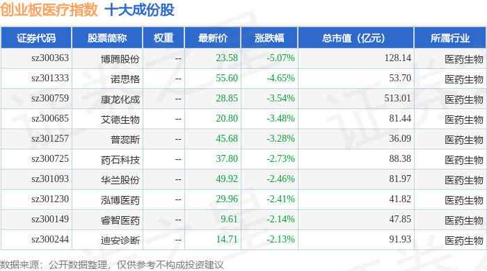 证券之星消息,12月15日,创业板医疗(970082)指数报收于3566.0点,跌1.19%,成交72.6亿元,换手率0.97%。当日该指数成份股中,上涨的有10家,英科医疗以2.91%的涨幅领涨,下跌的有40家,博腾股份以5.07%的跌幅领跌。