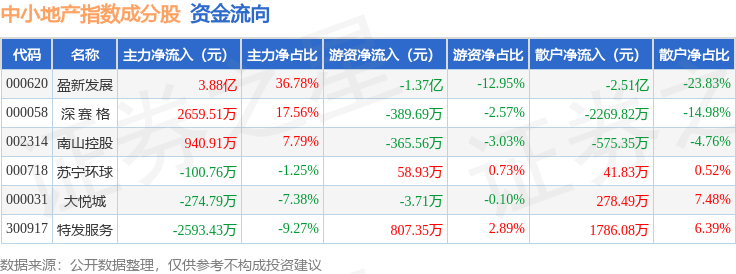 资金流向方面,中小地产(971002)指数成份股当日主力资金净流入合计3.94亿元,游资资金净流出合计1.35亿元,散户资金净流出合计2.59亿元。成份股资金流向详情见下表: