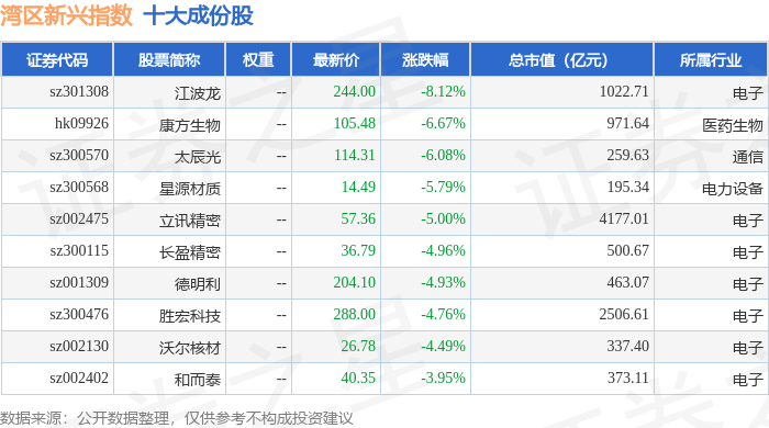 近10日内湾区新兴(980007)指数成份股做了调整,新纳入了5只股票,剔除了4只股票。