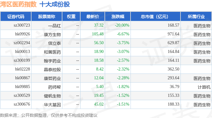 证券之星消息,12月15日,湾区医药(980013)指数报收于1873.31点,跌2.38%,成交66.78亿元,换手率0.77%。当日该指数成份股中,上涨的有7家,固生堂以1.92%的涨幅领涨,下跌的有23家,一品红以20.0%的跌幅领跌。