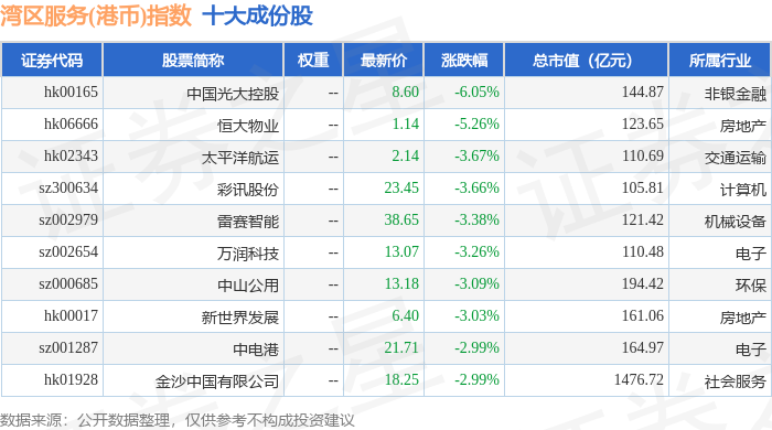 湾区服务(港币)(980012)指数十大成份股详情如下:
