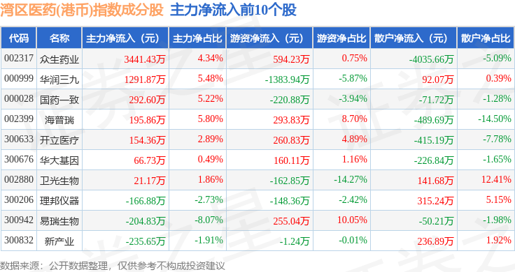 资金流向方面,湾区医药(港币)(980014)指数成份股当日主力资金净流出合计3.17亿元,游资资金净流入合计263.29万元,散户资金净流入合计3.14亿元。成份股资金流向详情见下表: