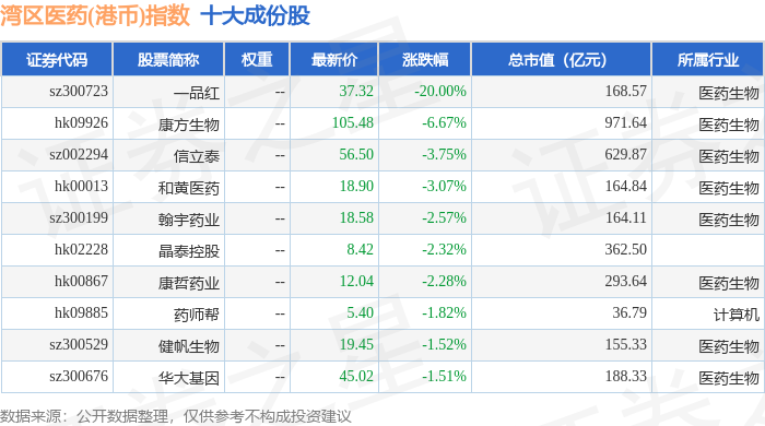湾区医药(港币)(980014)指数十大成份股详情如下: