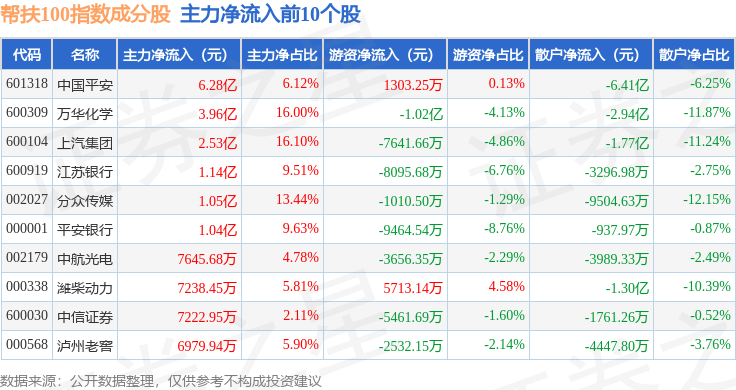 资金流向方面,帮扶100(980065)指数成份股当日主力资金净流出合计97.15亿元,游资资金净流入合计37.37亿元,散户资金净流入合计59.78亿元。成份股资金流向详情见下表: