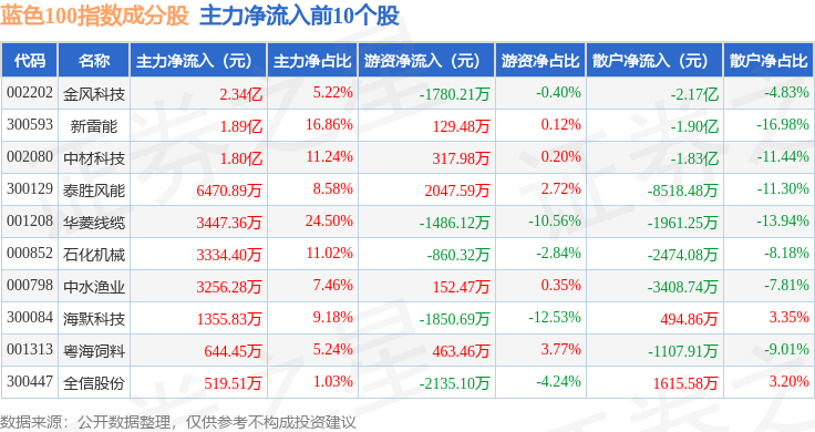 资金流向方面,蓝色100(980068)指数成份股当日主力资金净流出合计16.22亿元,游资资金净流入合计2.27亿元,散户资金净流入合计13.95亿元。成份股资金流向详情见下表: