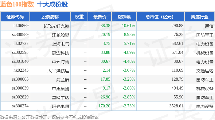 近10日内蓝色100(980068)指数成份股做了调整,新纳入了9只股票,剔除了2只股票。