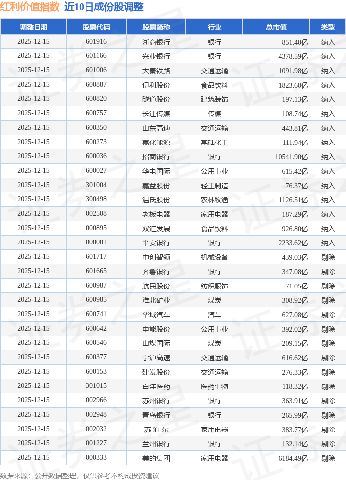 近10日内红利价值(980103)指数成份股做了调整,新纳入了15只股票,剔除了15只股票。