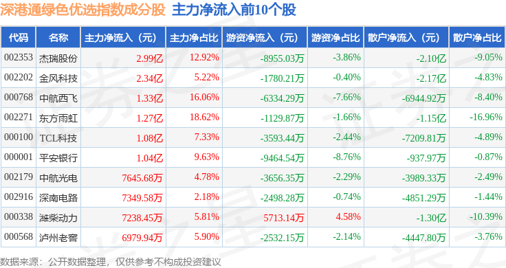 资金流向方面,深港通绿色优选(983011)指数成份股当日主力资金净流出合计16.45亿元,游资资金净流入合计2.37亿元,散户资金净流入合计14.08亿元。成份股资金流向详情见下表: