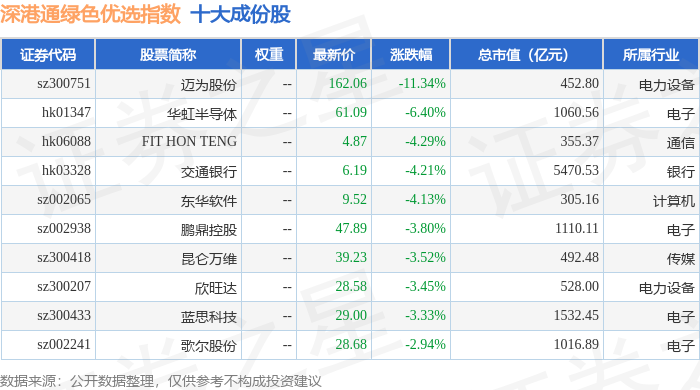 深港通绿色优选(983011)指数十大成份股详情如下:
