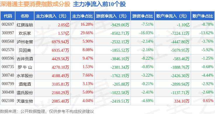 资金流向方面,深港通主要消费(983021)指数成份股当日主力资金净流入合计3.89亿元,游资资金净流出合计1.61亿元,散户资金净流出合计2.28亿元。成份股资金流向详情见下表: