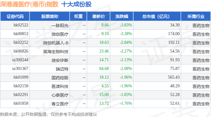 深港通医疗(港币)(983036)指数十大成份股详情如下: