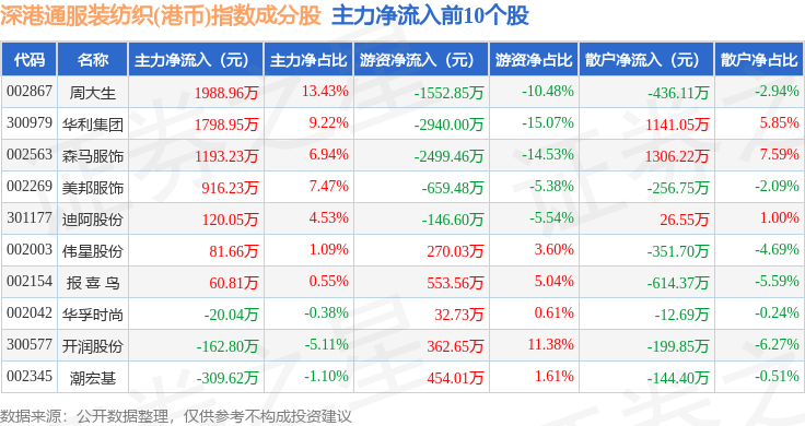 资金流向方面,深港通服装纺织(港币)(983042)指数成份股当日主力资金净流出合计2803.73万元,游资资金净流出合计5197.08万元,散户资金净流入合计8000.81万元。成份股资金流向详情见下表: