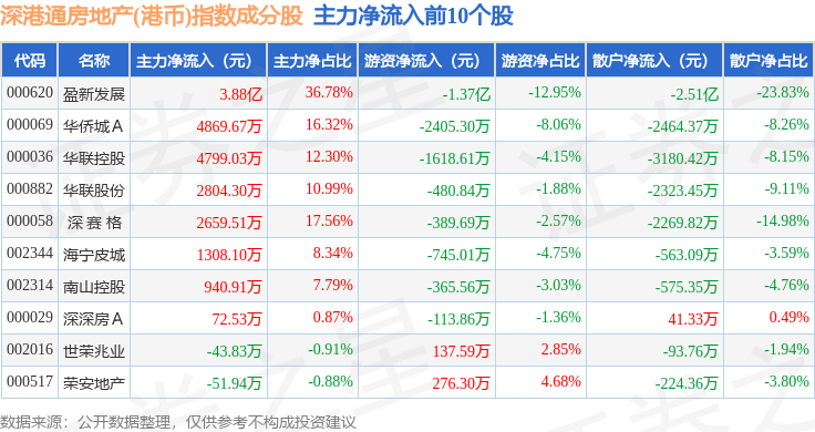 资金流向方面,深港通房地产(港币)(983072)指数成份股当日主力资金净流入合计2.32亿元,游资资金净流出合计2.32亿元,散户资金净流入合计61.04万元。成份股资金流向详情见下表: