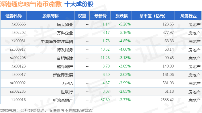 深港通房地产(港币)(983072)指数十大成份股详情如下: