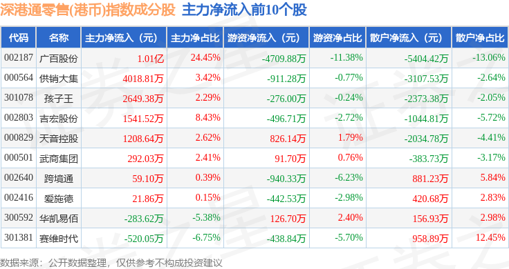 资金流向方面,深港通零售(港币)(983074)指数成份股当日主力资金净流入合计8311.45万元,游资资金净流出合计6799.79万元,散户资金净流出合计1511.66万元。成份股资金流向详情见下表: