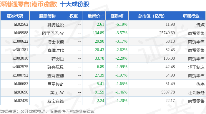 深港通零售(港币)(983074)指数十大成份股详情如下: