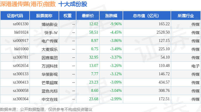 深港通传媒(港币)(983076)指数十大成份股详情如下: