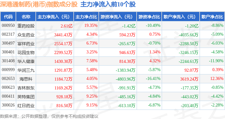 资金流向方面,深港通制药(港币)(983080)指数成份股当日主力资金净流出合计6.76亿元,游资资金净流入合计7746.95万元,散户资金净流入合计5.98亿元。成份股资金流向详情见下表: