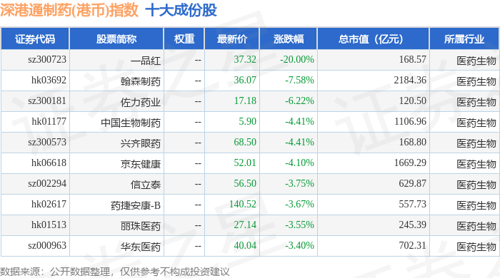 深港通制药(港币)(983080)指数十大成份股详情如下: