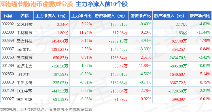 资金流向方面,深港通节能(港币)(983086)指数成份股当日主力资金净流出合计37.41亿元,游资资金净流入合计7.04亿元,散户资金净流入合计30.37亿元。成份股资金流向详情见下表: