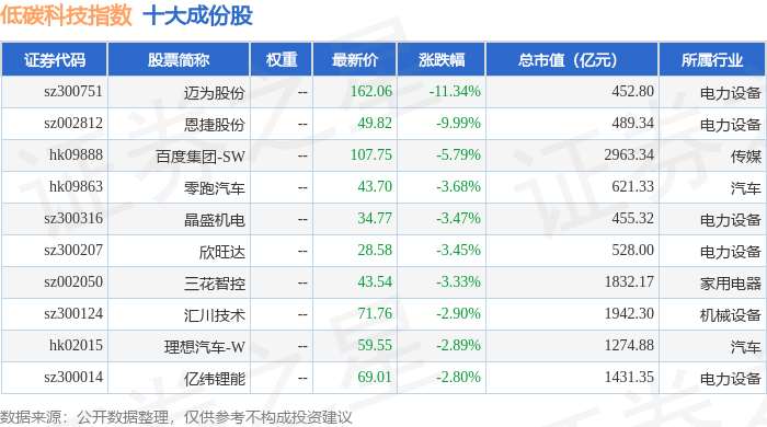 低碳科技(983160)指数十大成份股详情如下: