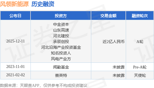 证券之星消息,根据天眼查APP于12月11日公布的信息整理,上海风领新能源有限公司A轮融资,融资额近2亿人民币,参与投资的机构包括中金资本,山东高速,河北建投,承辰创投,河北沿海产业投资基金,知名投资人,风电产业方。
